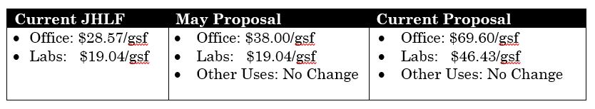 The JHLF was first established in the 1980s and applies to commercial projects over 25,000 square feet. In May of this year, Supervisor Haney introduced legislation to increase the JHLF on office to $38.00 per square foot, an approximate $10 increase over the current rate. Last week, Supervisor Haney modified the legislation to propose an office rate of $69.60 per square foot and a rate of $46.43 per square foot of lab space. A comparison of current and proposed rates follows: